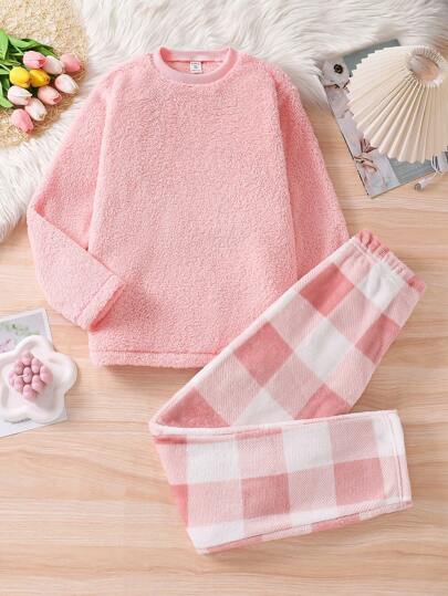 Sparklyn 少女 2 件套休闲简约格子连帽运动衫和裤子两件套,2024 年秋冬 - 粉色 - 查看 2