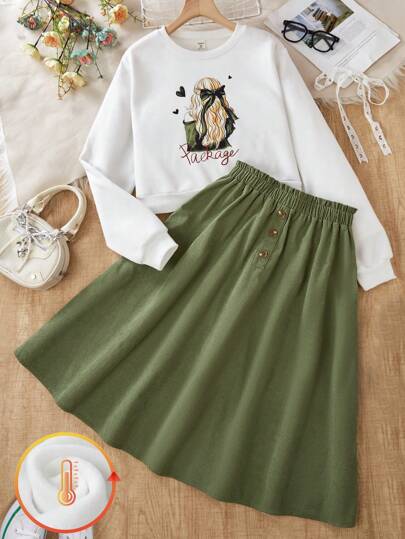 Sparklyn 青少年女孩卡通字母图案运动衫和松紧腰纽扣裙套装 - 綠色 - 查看 1