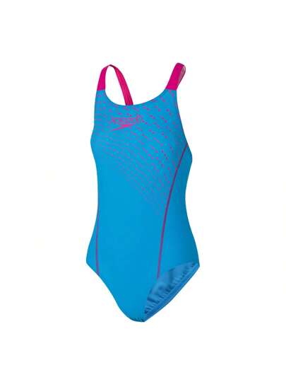 Speedo 女童时尚连体泳衣套装,适合温泉游泳 - 泳池藍/電光粉 - 查看 1