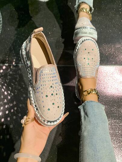 春秋季水钻装饰乐福鞋,女士透气休闲平底鞋,时尚套脚慵懒鞋 - 粉色 - 查看 1