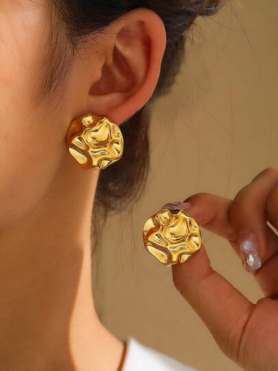 不锈钢不规则圆形耳环,独特设计,凹凸纹理元素,现代奢华风格,金色,女士日常通勤、派对、生日礼物 - 耳環 - 查看 1