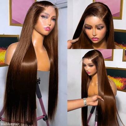 直发蕾丝前假发,真人混纺发丝,200%密度,13x4透明高清蕾丝假发,无胶假发,8-34英寸长,棕色直发,巴西真人发蕾丝假发,女士专用,预先拔毛发际线,带婴儿发,配有弹性发带,自然色,8-34英寸 - S4 - 查看 9