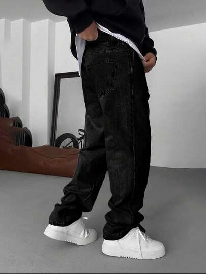 直筒水洗棉质牛仔裤,百搭阔腿水洗牛仔裤,情侣宽松直筒牛仔裤 - 黑色 - 查看 1