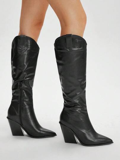 Styleloop 女式黑色拼布高筒靴,西部风格叠跟尖头靴 - 黑色 - 查看 1