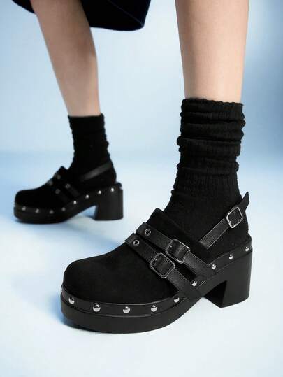 Sugerpunk 女式复古扣高跟凉鞋,时尚休闲粗跟穆勒鞋 - 黑色 - 查看 1