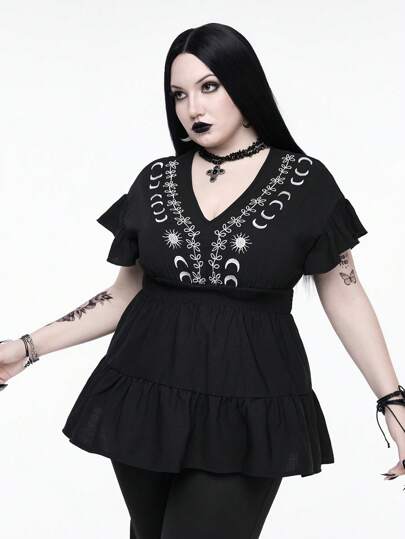 ROMWE Goth 夏季波西米亚风格花卉刺绣荷叶边下摆黑色衬衫,加大码 - 黑色 - 查看 1