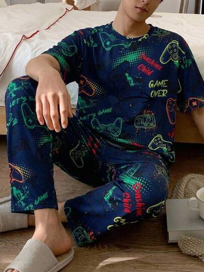 一套男童青少年睡衣,藏蓝色短袖彩色游戏手柄印花上衣搭配同款睡裤,时尚电竞风格,面料柔软透气,适合青少年游戏玩家穿着。