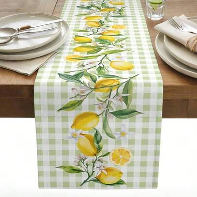 夏季柠檬水果绿白格子桌旗厨房餐厅装饰,适用于节日派对、室内外、婚礼派对装饰