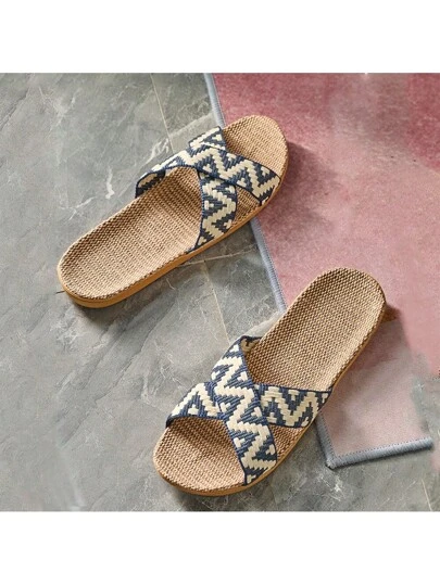 夏季亚麻拖鞋,轻便防滑室内拖鞋,软底家居拖鞋,时尚简约卧室拖鞋 - 藏蓝色 - 查看 1