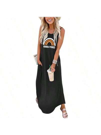Summer Maxi Dress Casual V-Neck Sleeveless Bohemian Spaghetti Strap Floral Long Maxi Dress With Pockets