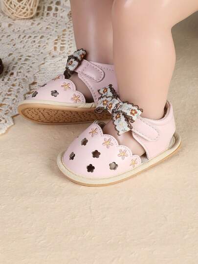 夏季新款女婴花朵蝴蝶结镂空透气凉鞋,舒适防滑,3-6-9个月 - 粉色 - 查看 1