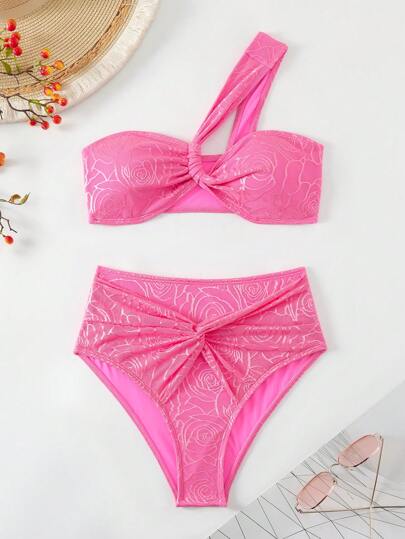 SHEIN Swim 夏季单肩提花比基尼泳装套装情人节 - 玫紅色 - 查看 1