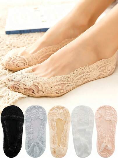 夏季女士隐形船袜防滑透气蕾丝花朵隐形袜防滑凉薄女士短踝袜 - 彩色 - 查看 5