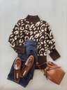 女士针织圆领短袖豹纹针织套头衫,经典休闲风格,适合日常旅行通勤毛衣秋季女装