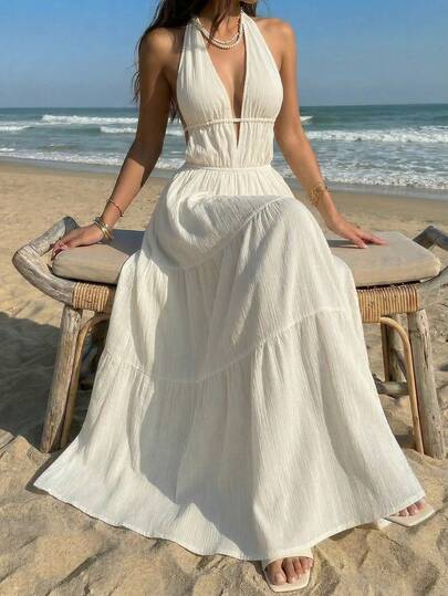 Sunnyshic 杏色纹理褶皱深V露背吊带收腰连衣裙,女士春夏度假波西米亚风海滩婚礼优雅甜美简约休闲百搭