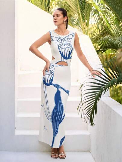 Sunsella 印花无袖镂空开衩优雅长裙夏季女士度假海滩 - 彩色 - 查看 1