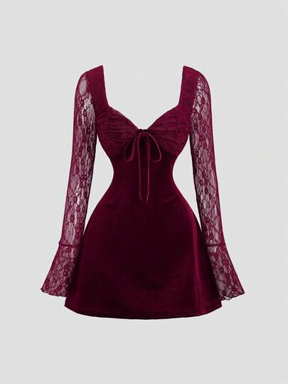 Sweetra 优雅法式秋季新款丝绒撞色蕾丝红色情人节系列连衣裙,性感派对独特设计长袖迷你连衣裙,女士 - 酒紅色 - 查看 1