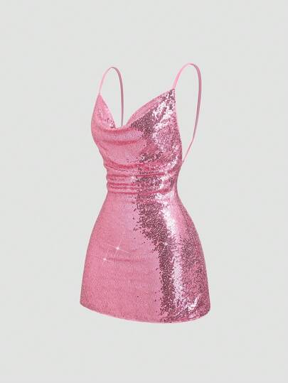 Sweetra 女士夏季粉色亮片腰部镂空不对称蝴蝶结露背A字甜美度假风迷你荷叶边吊带连衣裙