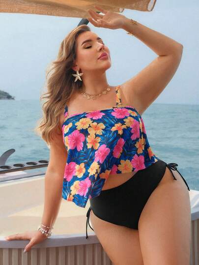 Swim Lushoire 大码女士热带植物印花性感休闲吊带泳衣两件套 - 彩色 - 查看 1