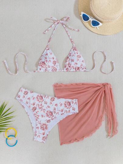 Swim Mod 夏季海灘女士假期花卉印花領口綁帶性感比基尼套裝,附蓋裙,隨機印花,3件套裝 - 乾枯玫瑰色 - 查看 3