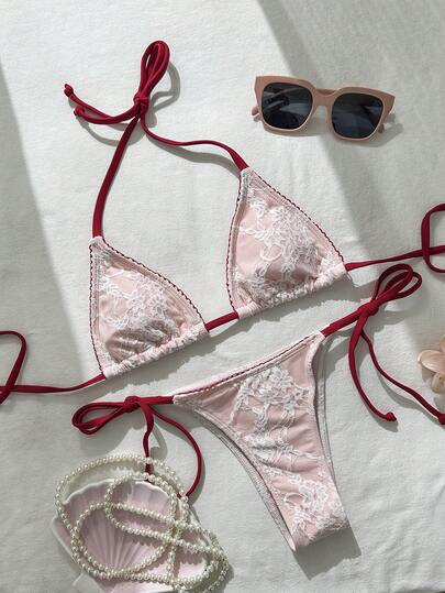 Swim Mod 女士春夏提花面料挂脖花卉饰边比基尼套装 - 粉色 - 查看 1