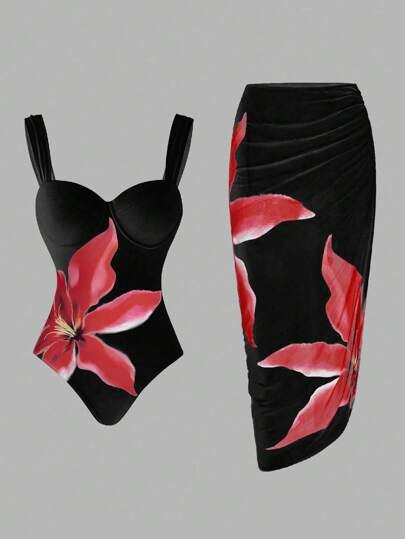 Swim Oasis 女式花卉印花假日时尚细肩带连体泳衣搭配垂褶罩衫和荷叶边裙子套装夏季 - 黑色 - 查看 1