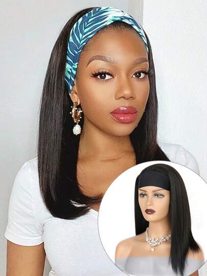 合成材料頭帶假髮短款絲滑直發16-24吋,配有圍巾、耐高溫、自然的頭帶假髮女士專用-棕黑色 - 棕色 - 查看 6