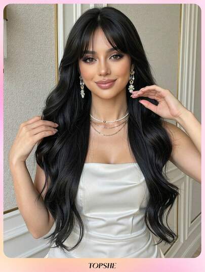 TOPSHE 13*5*1 T型蕾丝前假发,24英寸柔软黑色无刘海假发,耐热合成纤维,适合日常、派对、旅行、角色扮演、圣诞节及其他场合。 - 黑色 - 查看 1
