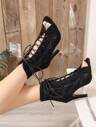 女式中跟镂空网眼优雅舞蹈踝靴,罗马风格镂空系带靴,黑色优雅镂空系带靴