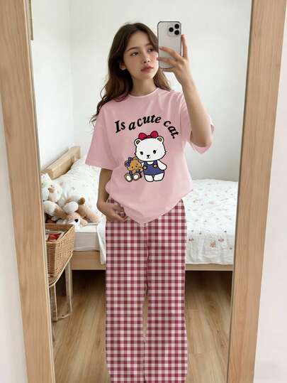 少女休闲宽松简约圆领短袖长裤睡衣套装,适合春夏穿着