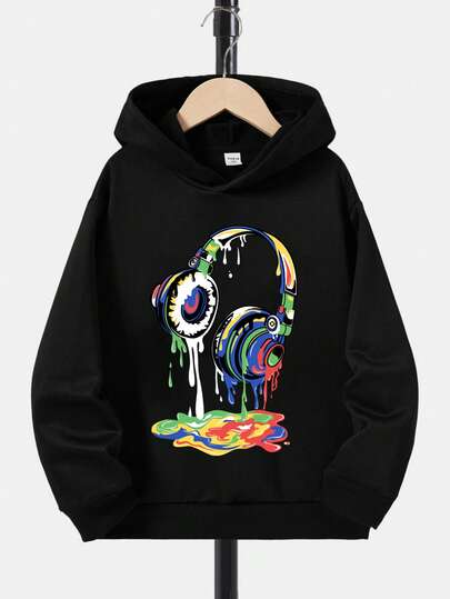 青少年男童休闲简约耳机图案长袖卫衣,适合秋冬季穿着 - 黑色 - 查看 1