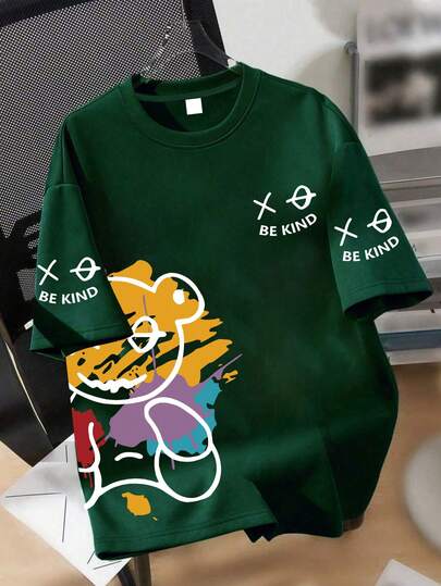 青少年男童街头涂鸦熊图案短袖宽松柔软凉爽T恤,夏季街头休闲装,男童上衣 - 墨綠色 - 查看 1