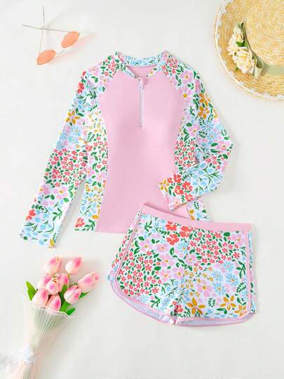2 件青少年女孩花卉印花泳衣套装,休闲派对海滩度假,春夏,情人节心形粉色/洋红色,礼物 - 彩色 - 查看 1