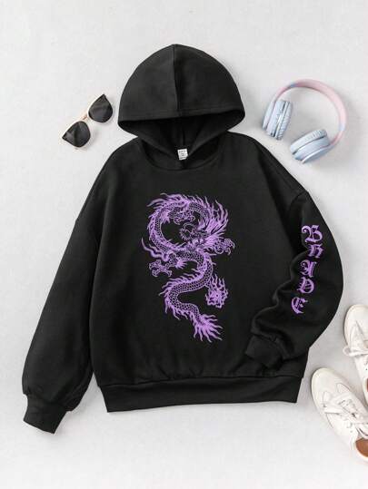 少女日文字母和中国龙图案落肩卫衣 - 黑色 - 查看 1