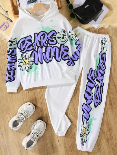 青少年女孩字母圖案連帽衫和運動褲 - 彩色 - 查看 1