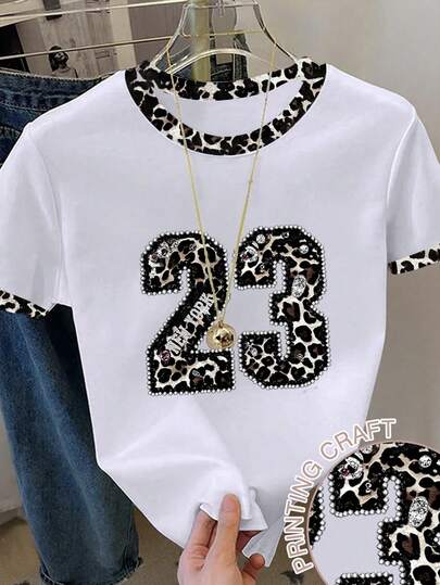 少女休闲时尚复古豹纹仿水钻设计,23号豹纹领时尚衬衫,夏季装扮 - 彩色 - 查看 1