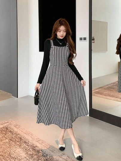 少女 2 件套:黑色千鸟格印花连衣裙和黑色高领修身 T 恤,优雅办公室套装千鸟格连衣裙中长连衣裙休闲连衣裙格子连衣裙格纹连衣裙长袖连衣裙 16 岁中长款女孩连衣裙长袖连衣裙长裙女孩 - 黑與白 - 查看 2