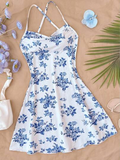 少女休闲度假风针织弹力舒适连衣裙,可调节肩带,修身剪裁,独特的大朵花卉图案,充满度假气息,适合日常穿着、外出、派对、度假等场合,高品质夏季单品