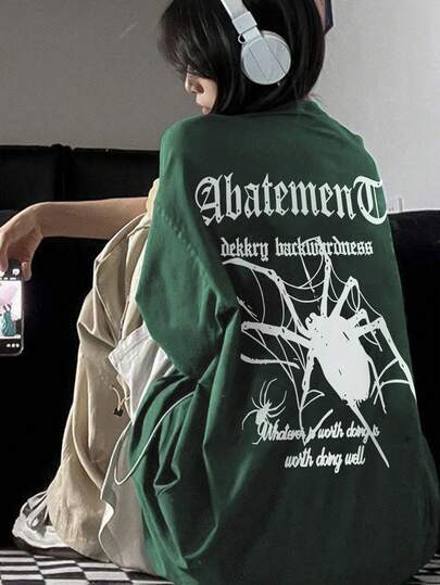 少女哥特蜘蛛图案T恤,白色短袖T恤,印有标语,适合夏季/派对穿着。