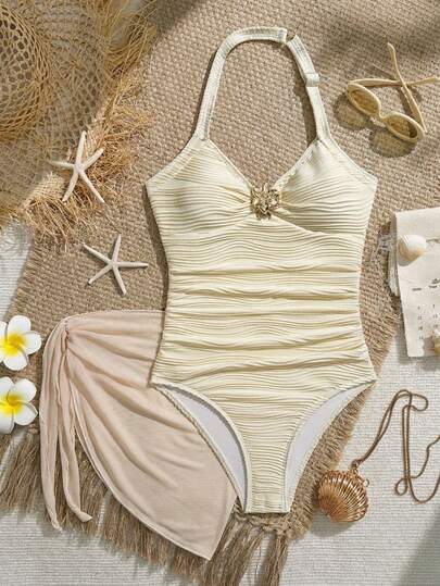 少女露背连体泳衣,带收腹裙,两件套泳装,适合学生海滩度假,温柔 - 白色 - 查看 1