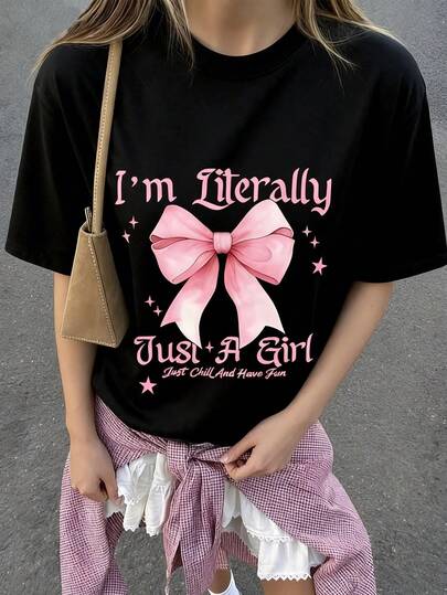 少女卡通蝴蝶结标语印花圆领T恤,Y2K风格休闲柔软舒适上衣,春夏款 - 黑色 - 查看 1