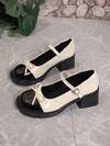 法式蝴蝶结玛丽珍鞋,撞色设计,方头,粗跟,青少年直扣搭扣,学院风小皮鞋