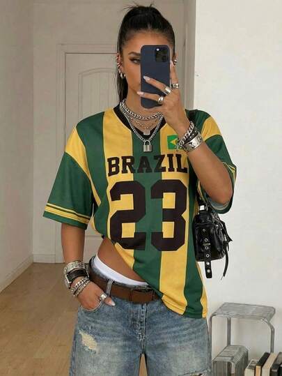 青少年女孩宽松休闲V领短袖T恤,适合夏季穿着