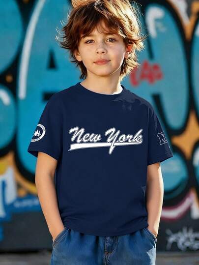 青少年圆领短袖T恤,休闲简约标语印花,舒适男童服装,春夏新品 - 藏蓝色 - 查看 1
