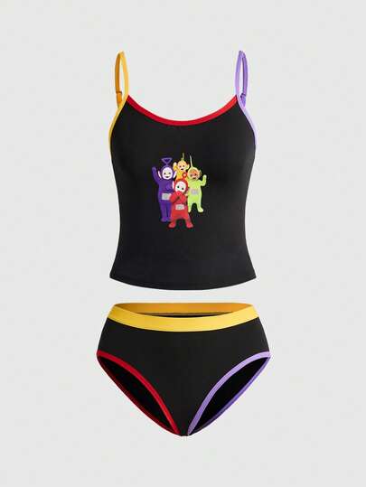 Teletubbies X ROMWE 女士卡通图案撞色滚边吊带背心和内裤套装 - 黑色 - 查看 1
