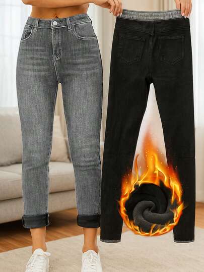 冬季保暖内衬紧身洗水牛仔裤 - 淺灰色 - 查看 1