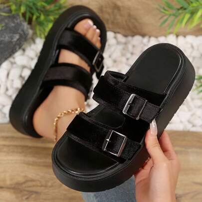 女士厚底双扣拖鞋,夏季户外穿着,新款设计,厚底,百搭,沙滩鞋,娇小身材增高款 - 黑色 - 查看 1
