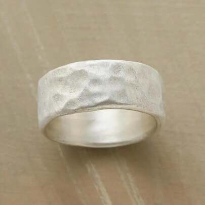 这款戒指散发着原始、粗犷的手工质感,表面采用不对称锤纹,呈现出高端简约的美感,适合户外佩戴。