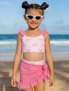 女童三件套比基尼,可爱粉色竖条纹蝴蝶结针织面料肩带纯色荷叶边网纱裙,时尚休闲优雅,适合游泳、夏季度假、海滩、泳池、节日派对
