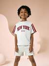 SHEIN 两件套男童休闲运动可爱花卉字母印花红色丝带圆领短袖T恤和短裤套装,适合通勤、上学、日常休闲穿着、运动、春夏穿着。